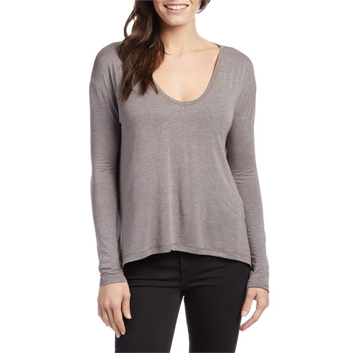 Tricot à manches longues, col en V, ourlet haut-bas et détails de fentes latérales.