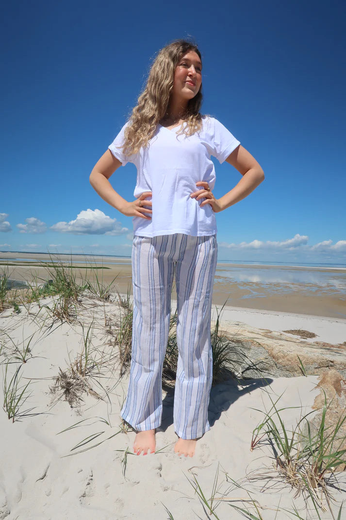 Pantalon de plage 100 % coton, blanc et bleu marine. Brillant et élégant, confortable et mignon !