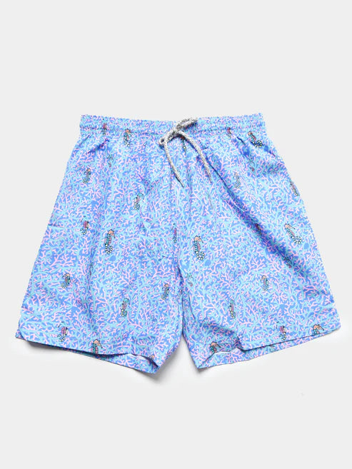 A breathable swim trunk made from soft, quick-drying fabric with comfortable four-way stretch and an abstract fish print.