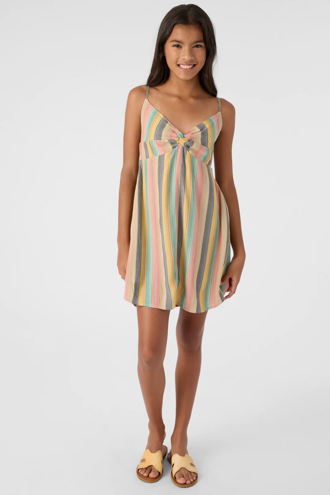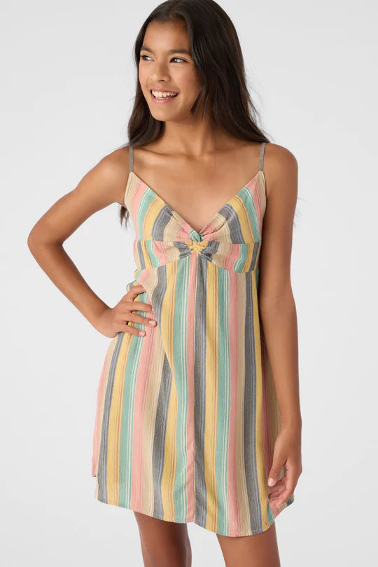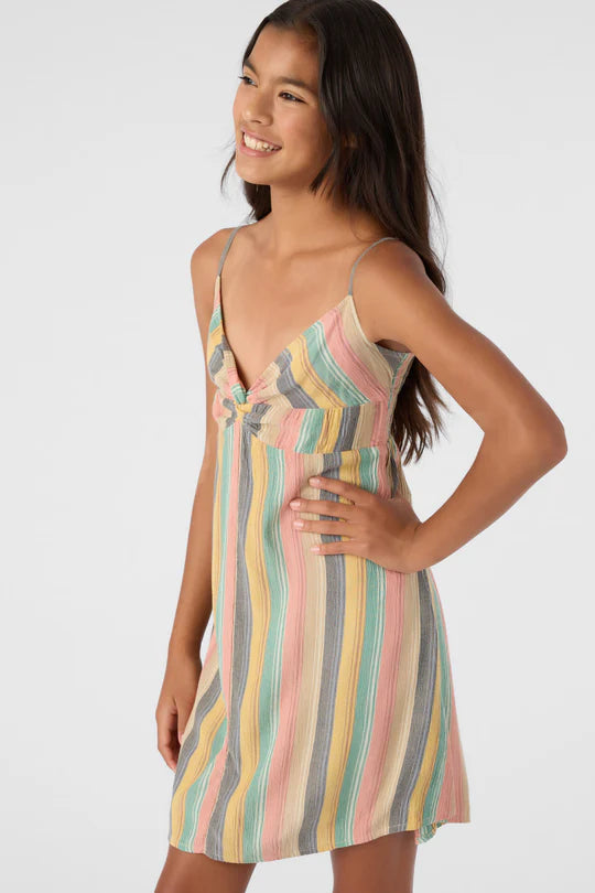 Présentation de la robe débardeur Tobia pour filles d'O'Neill. Cette élégante robe débardeur tissée présente un corsage torsadé au centre sur le devant pour une touche unique et un dos froncé pour une coupe confortable. Avec une longueur de 19 pouces, des ajusteurs de bretelles et une fabrication 100 % viscose froissée, c'est le complément parfait à votre garde-robe d'été.