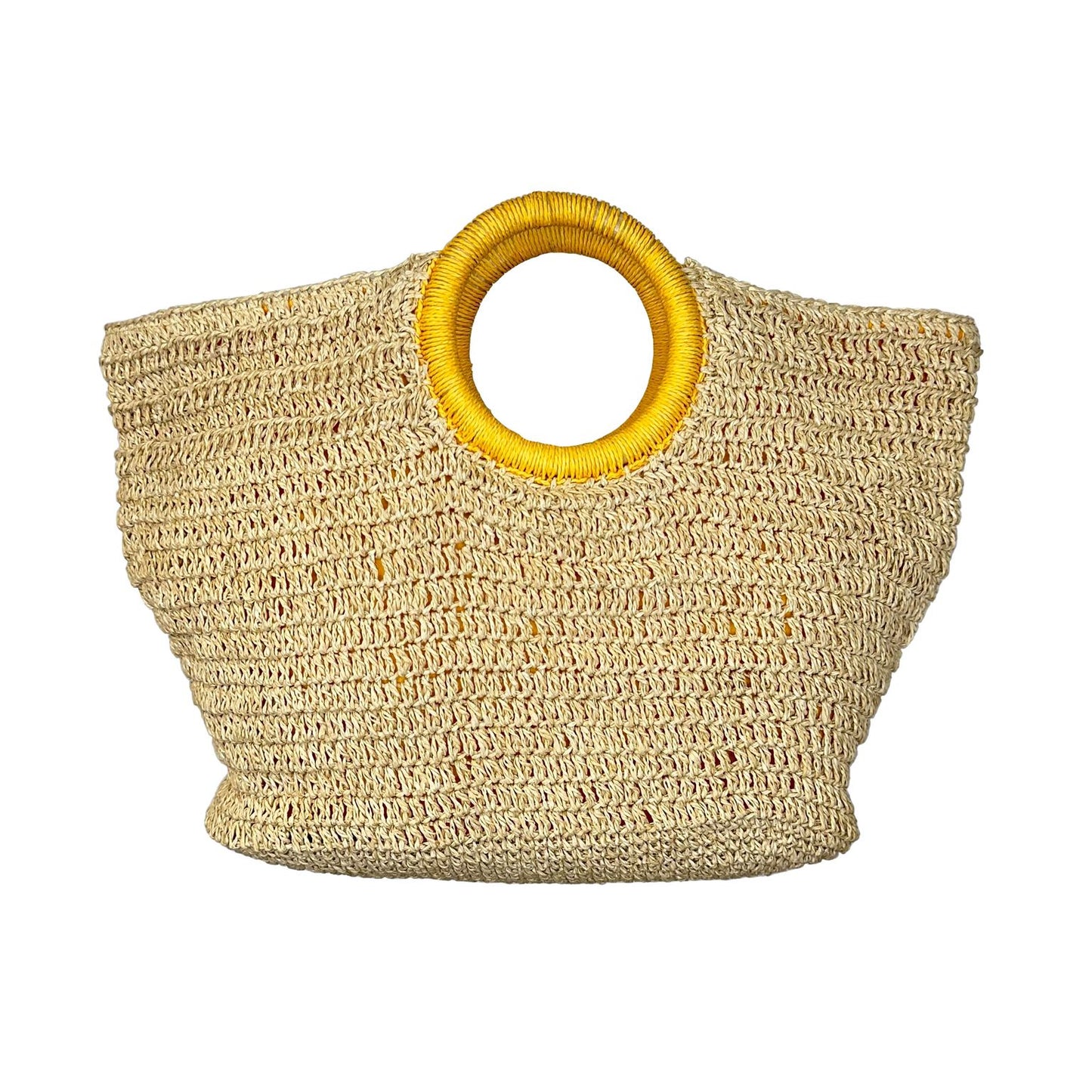 Woven raffia basket bag with colorful fabric wrapped wooden handle and matching fabric inner lining. Comes in four colors.