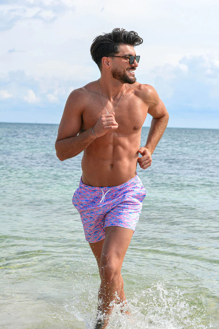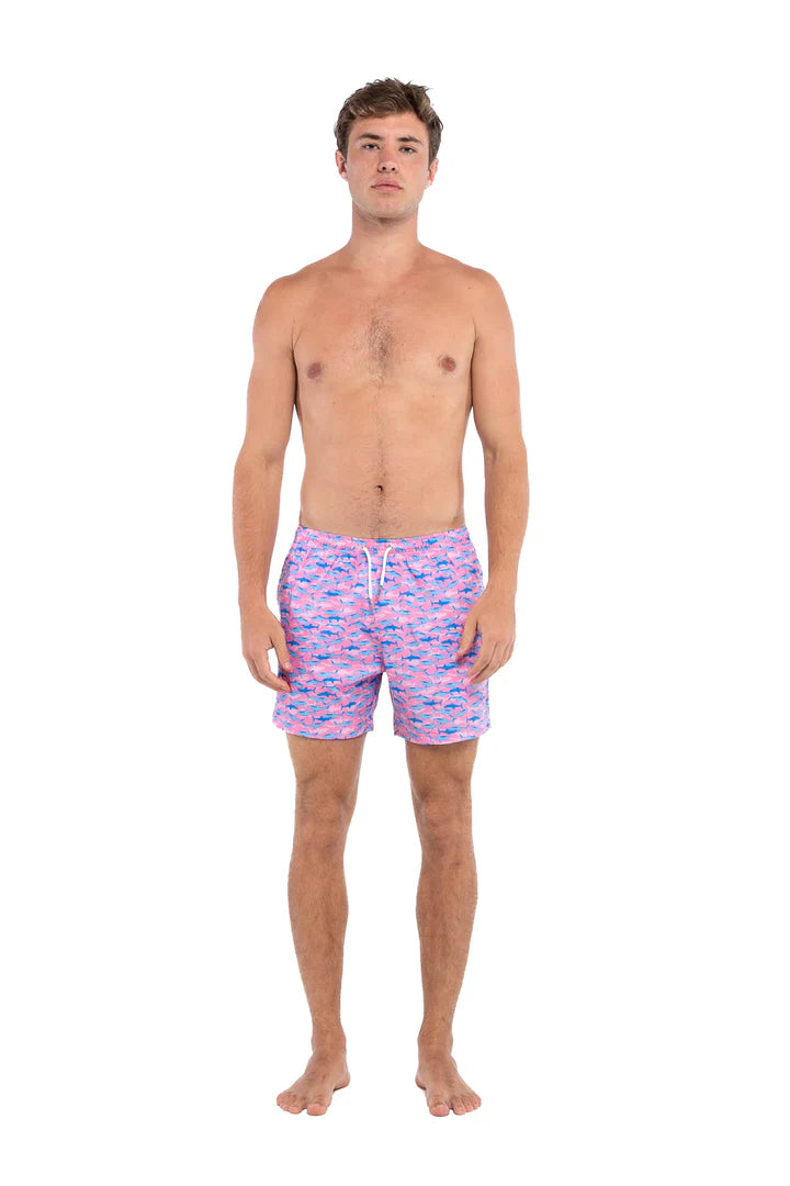 Bermies Mens Pink Sharks Classic Swim Trunks w/Liner