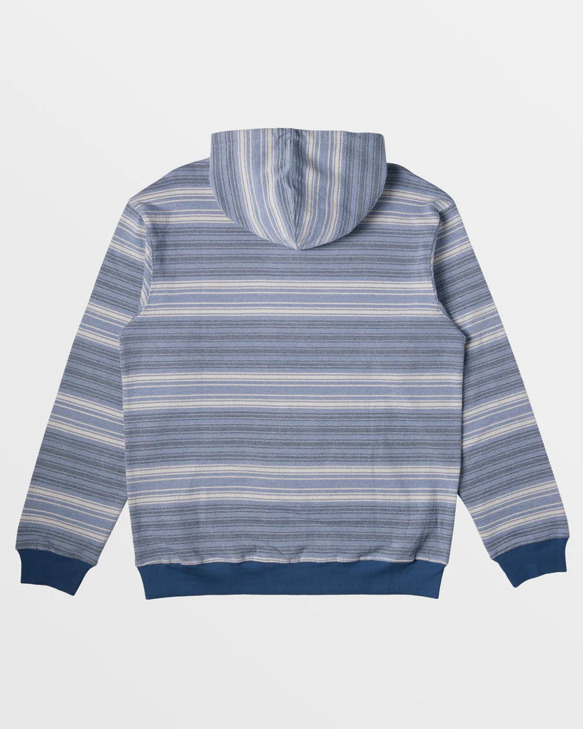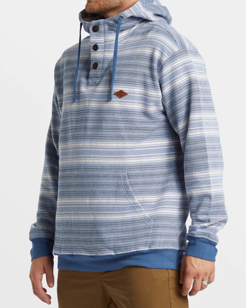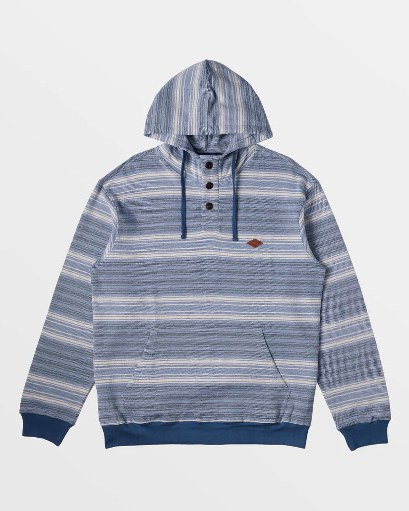 The Rancho hoodie brings modern comfort with a coastal flair, combining yarn-dyed stripe cotton fabric and a henley neckline with button detailing. Featured here in the Smoke Blue colorway.