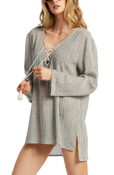 Stay stylish and comfortable in this Billabong Women's Blue Skies Long Sleeve Cover Up Dress. Crafted with 100% cotton for a breezy fit, the dress features v-neck and long sleeves, and is detailed with roped cording weaving up the neck. Perfect for taking a beach stroll in style!