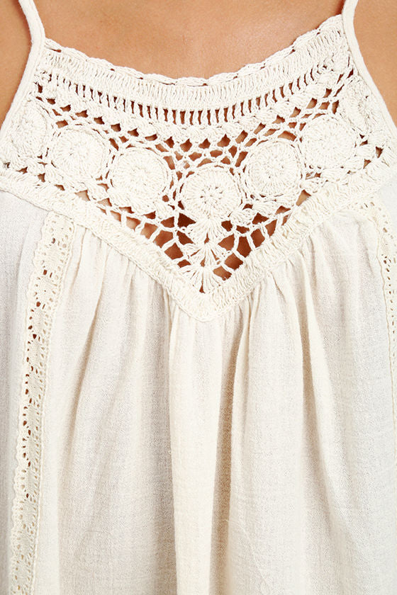 When the Billabong Midsummer Tides Cream Crochet Top emerges from your closet, you'll know a day of sunshine is around the corner! Adjustable spaghetti straps top a crochet decolletage. Vertical lace panels decorate the woven, wide-cut bodice. Small metal logo tag at back.