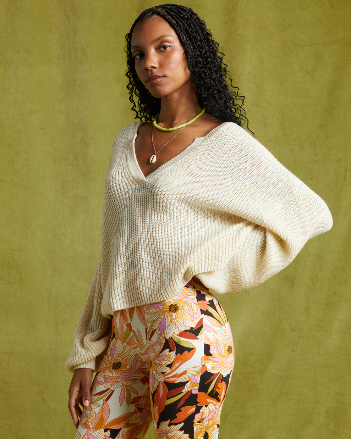 Comfy and carefree, the No Worries Sweater truly lives up to its name. This V-neck pullover has a relaxed fit made of cozy cotton-knit fabric and ribbed trim.
