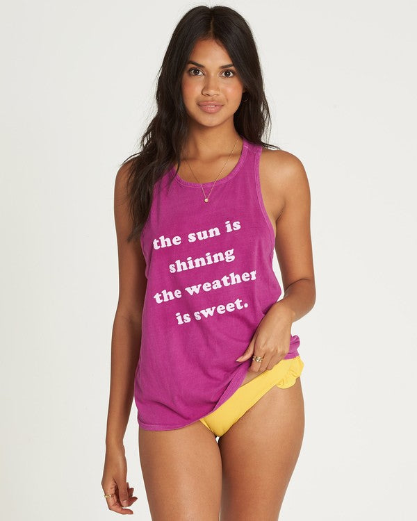Soak up the sun and the positive vibes. Cut with a sporty racerback, the women’s graphic tank top is printed with “the sun is shining the weather is sweet” text at the center front. The tank top is made from 100% cotton jersey.