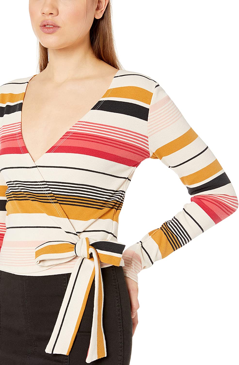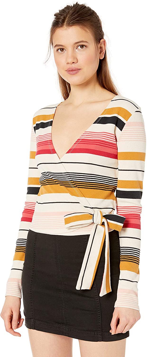 Revive a sun-baked 70’s stripe in a timeless wrap top silhouette. Made from a soft rib knit, the Wrap City long sleeve features a fixed wrap cut with a low V neckline and tie at the front left side.