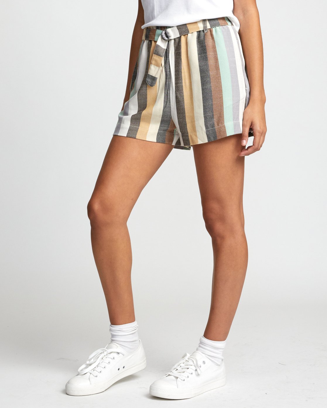 A vintage high waisted short with an industrial edge, the rvca juno short features an allover stripe and subtle hardware trim. The womens striped shorts are finished with elastic at the back for the perfect fit and a self belt with a metal ring fastener.
