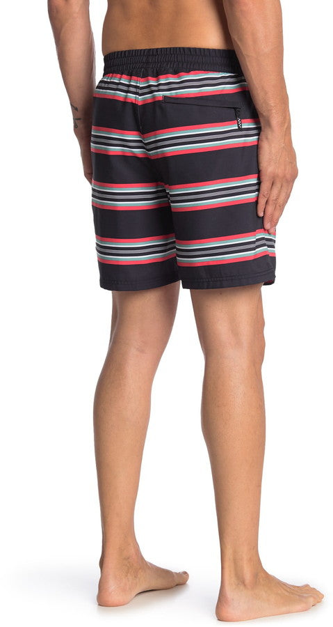 Classic stripes add a sporty vibe to these go-anywhere volley shorts. Details: Elastic waist with ties Dual side pockets Back zip pocket Color/Pattern: Black with Stripes (coral, gray, and white) Size: XL Approx. Measurements: Waist: 17", Length: 17.5", Inseam: 7" Fabric: 100% polyester Care: Machine wash