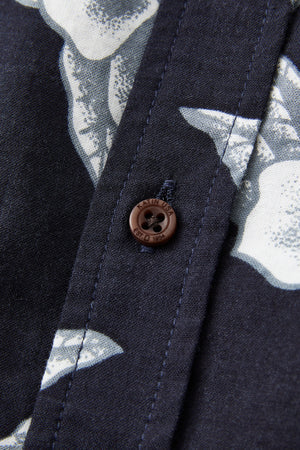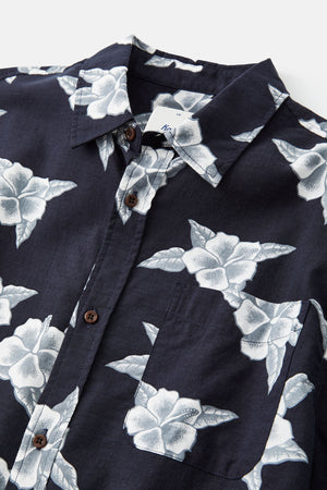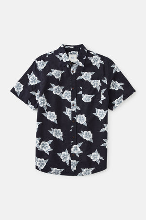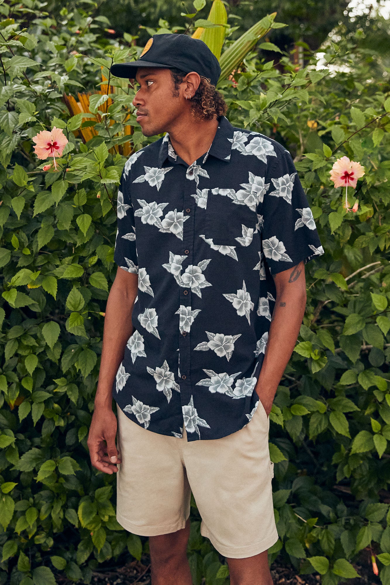 The Hibiscus Shirt features a flower pattern atop a breathable cotton/viscose button-up woven shirt.