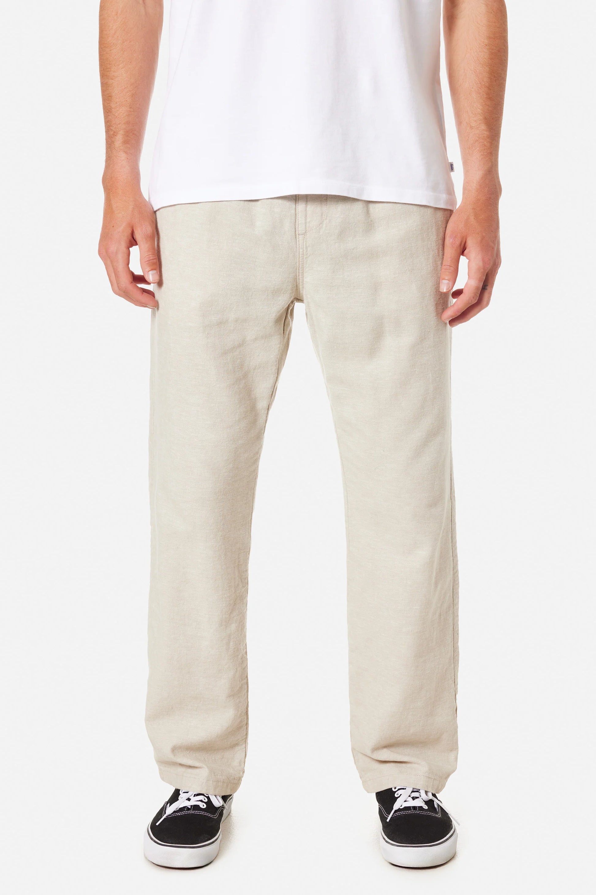 Made from the same light cotton linen blend fabric as the Isaiah Local Short, the Isaiah Local Pant is both comfortable and good-looking. Featuring our cropped 28" inseam, the Isaiah Pant has side seam welt pockets, an elastic waistband with external drawcord, back welt pockets, and a faux fly.