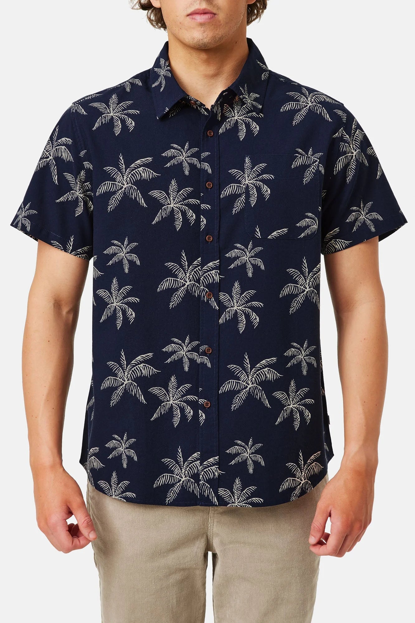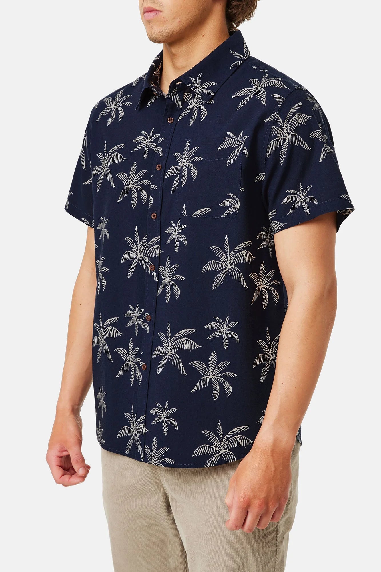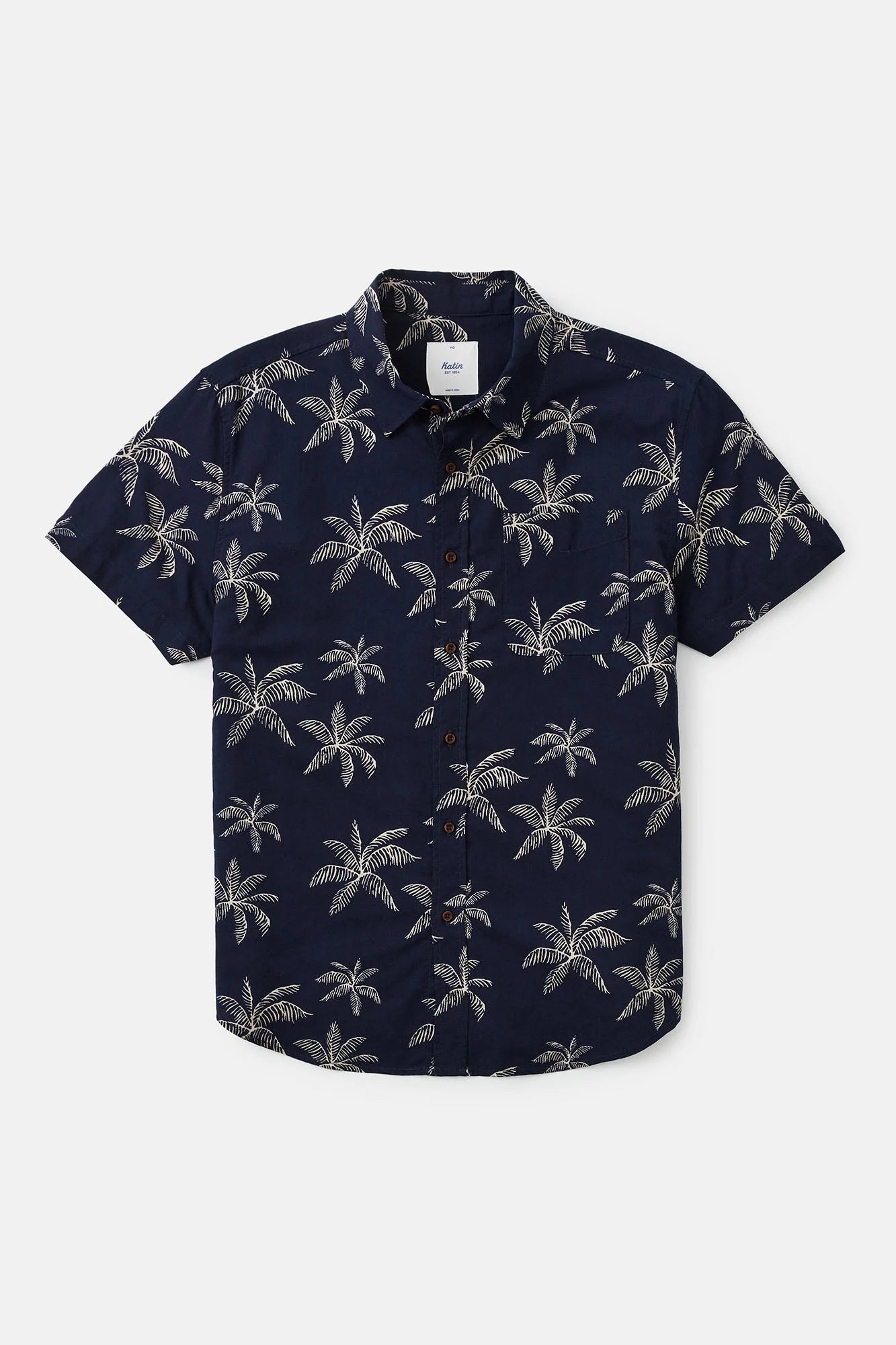 The Mai Tai Shirt features a custom palm print atop a breathable cotton/linen button-up woven shirt.