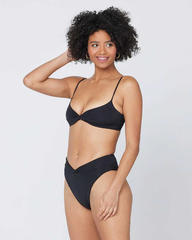 The Ringo is a vintage-inspired top with bold style and a twist front detail. Features fully-adjustable back ties and straps.