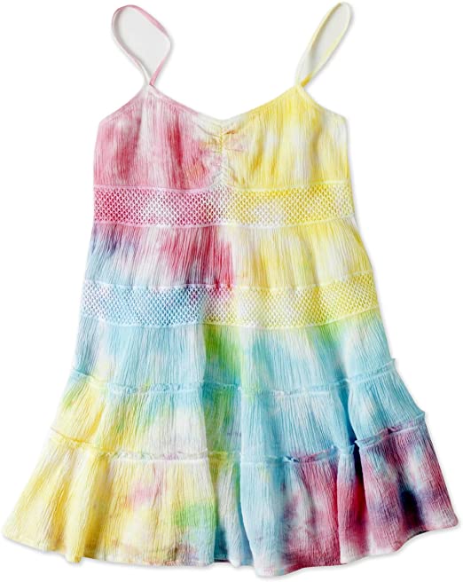 Tiered ruffles with inset crochet, spaghetti straps with adjusters, back smocking, fully lined, with metal logo badge