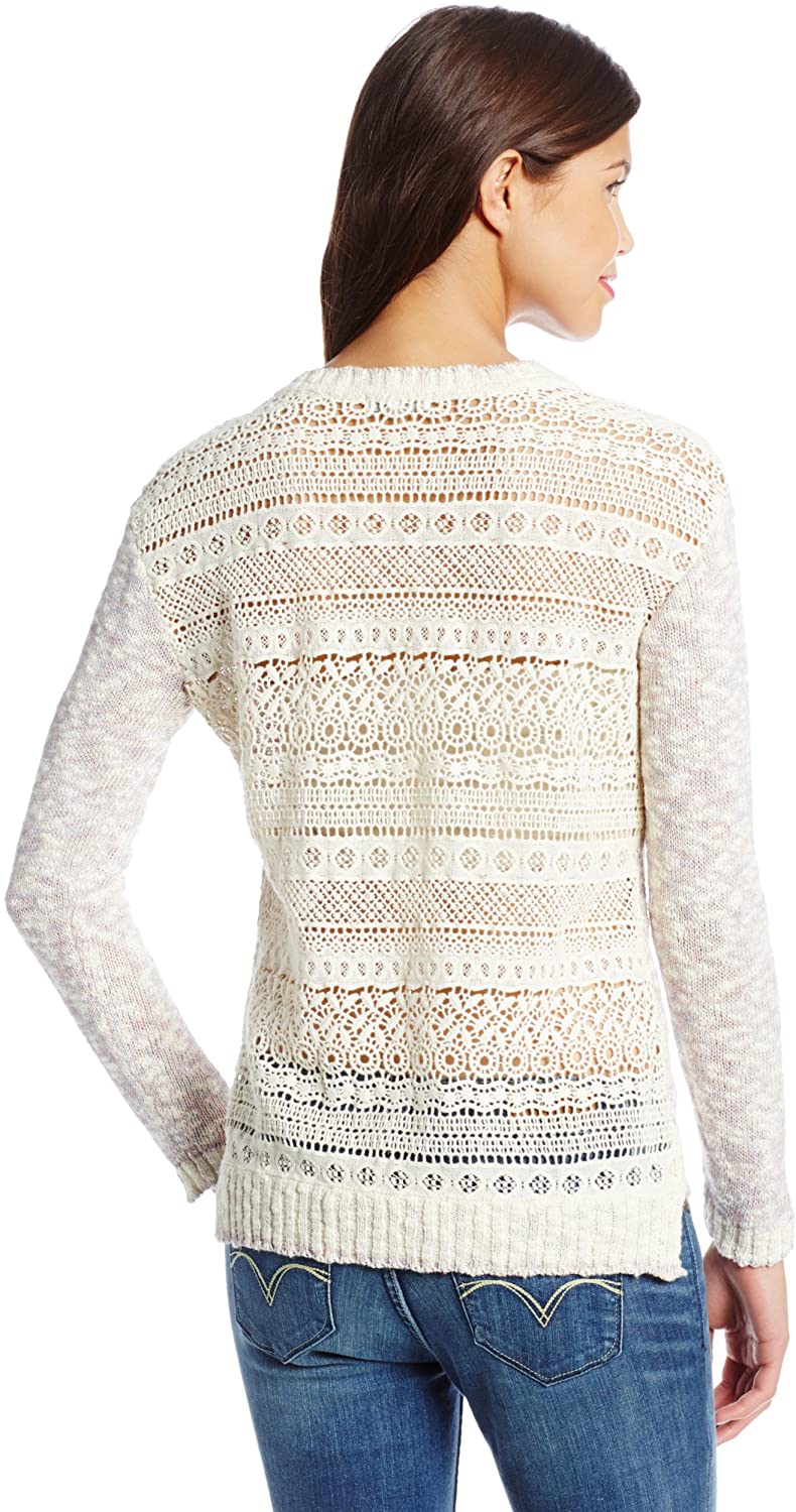 This sweater-knit top is 21 1/2" in length with basic pullover styling and a slight high/low hem line. It features a cotton crochet back panel; rib knit at the neck, cuffs and hem; and a metal logo badge. 70% cotton/ 30% nylon.