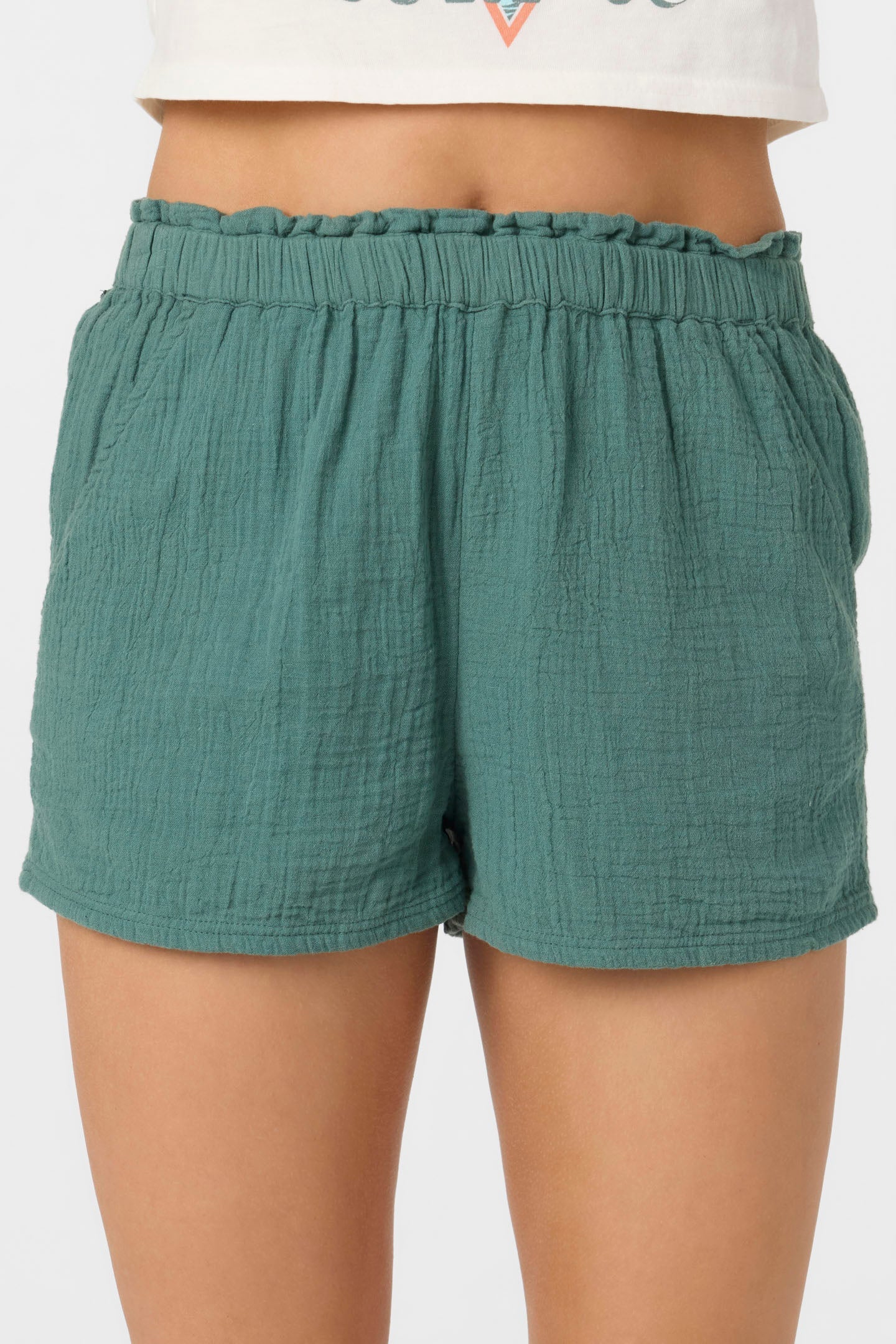 Effortlessly stylish woven pull-on short that features a solid color design, front slash pockets and paper bag waistband detail.