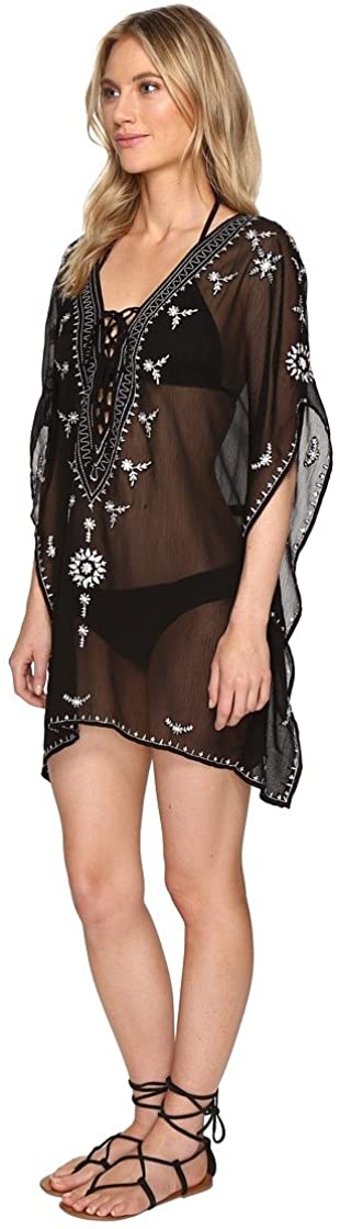 Embroidered caftan cover up, lace up detail at front neckline, side slits, 100 percent polyester, 32 inch