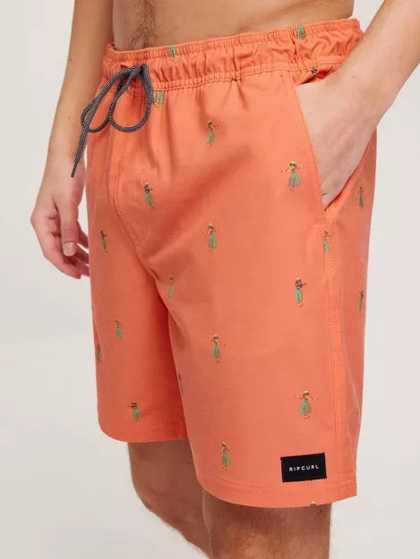 Hit the beach in the Hula Breach Volley, featuring side pockets, woven label, back pocket with flap, engineered yardage print, and hydrophobic quick-dry technology.