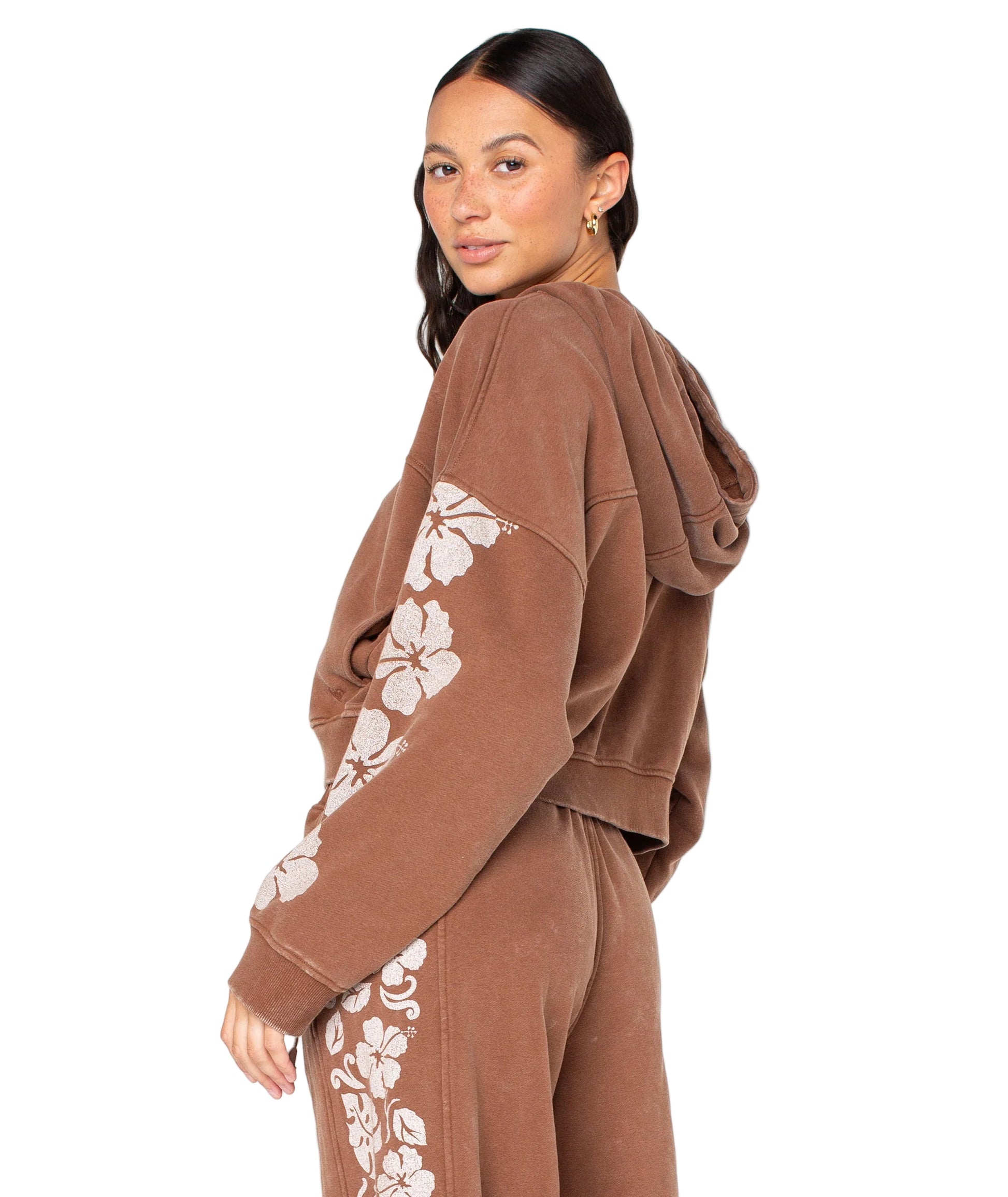 A classic womens hoodie zip‑up silhouette reimagined with earth tones and coastal charm. Made for crisp mornings and weekend bonfires, the Fringing Reefs sweatshirt features striking placed hibiscus screen-print detailing cascading down both arms—adding a bold, beachy accent. With its relaxed fit and thoughtful finish, this midweight layer is destined to be your next fall favorite.