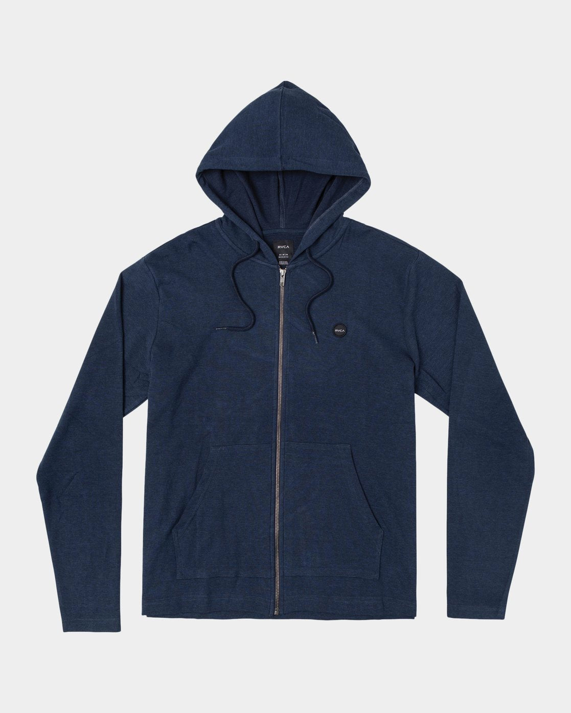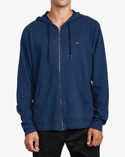 Regular fit. Long sleeve zip front hooded knit. Mini motors patch at chest. Kangaroo pocket.