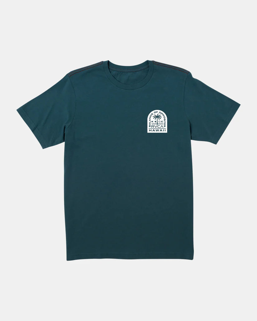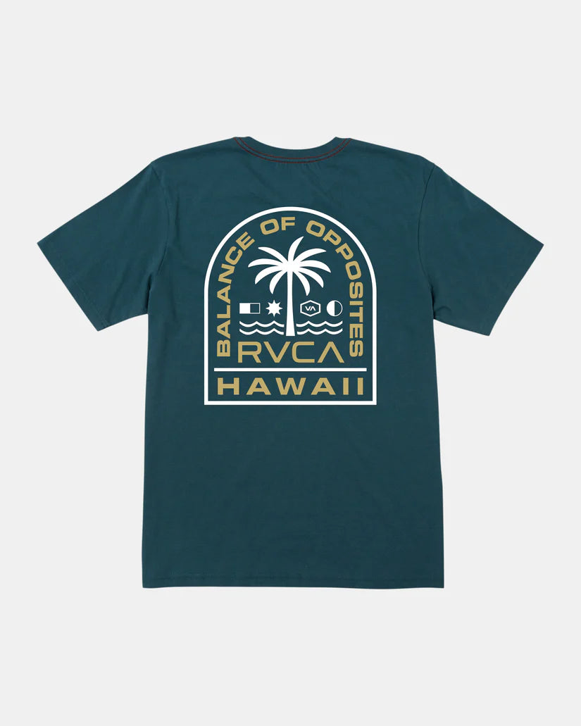 Push your performance with RVCA's Hawaii Collection Tropics T-Shirt. Featuring screen-printed graphics at the chest and back, this regular-fit crew neck tee is crafted of soft cotton jersey and styled with the trademark RVCA red stitch.