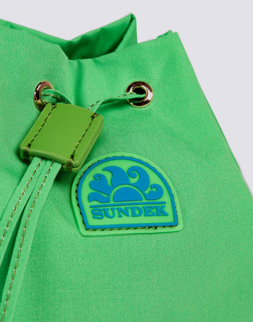 Solid colour drawstring bucket bag with side handle, elegant gold detailing and inside zip pocket. An original bag, to match with different looks and that will make you stand out.