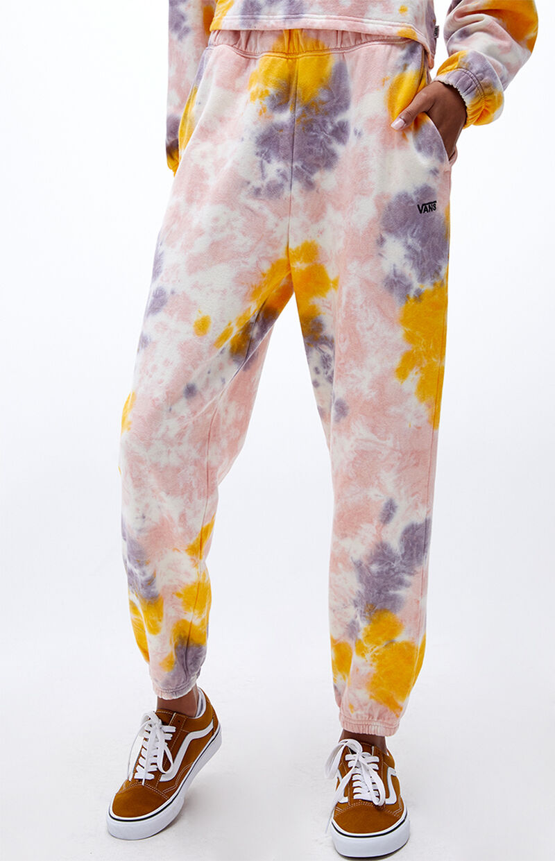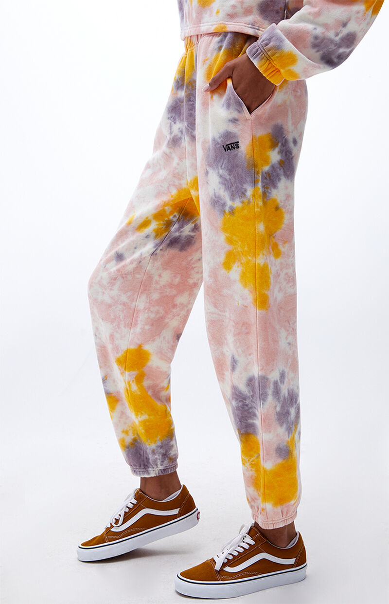 Bring the edge with the new Grunge Wash Sweatpants from Vans. This comfy pair features an elastic stretch waistline, side pockets, a standard fit, elastic stretch cuffs, and a tie-dyed fleece fabrication.