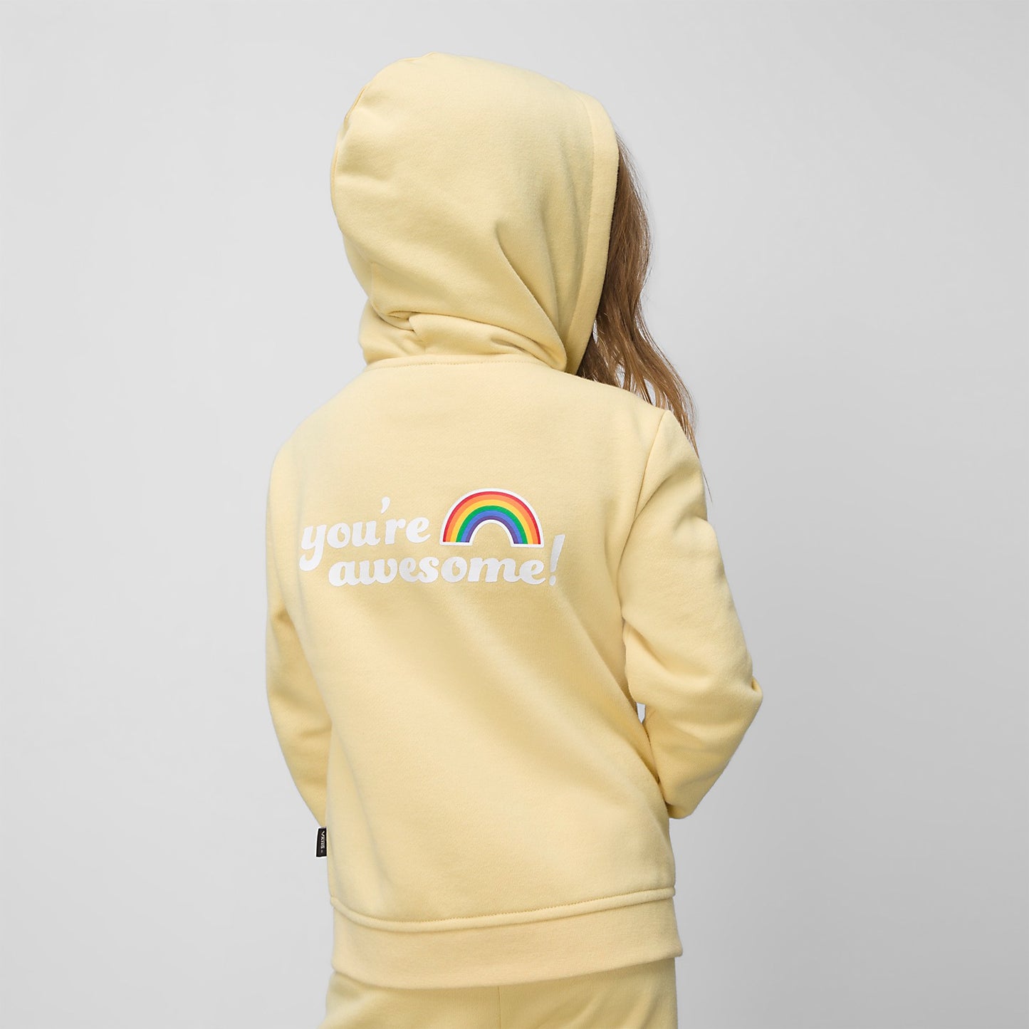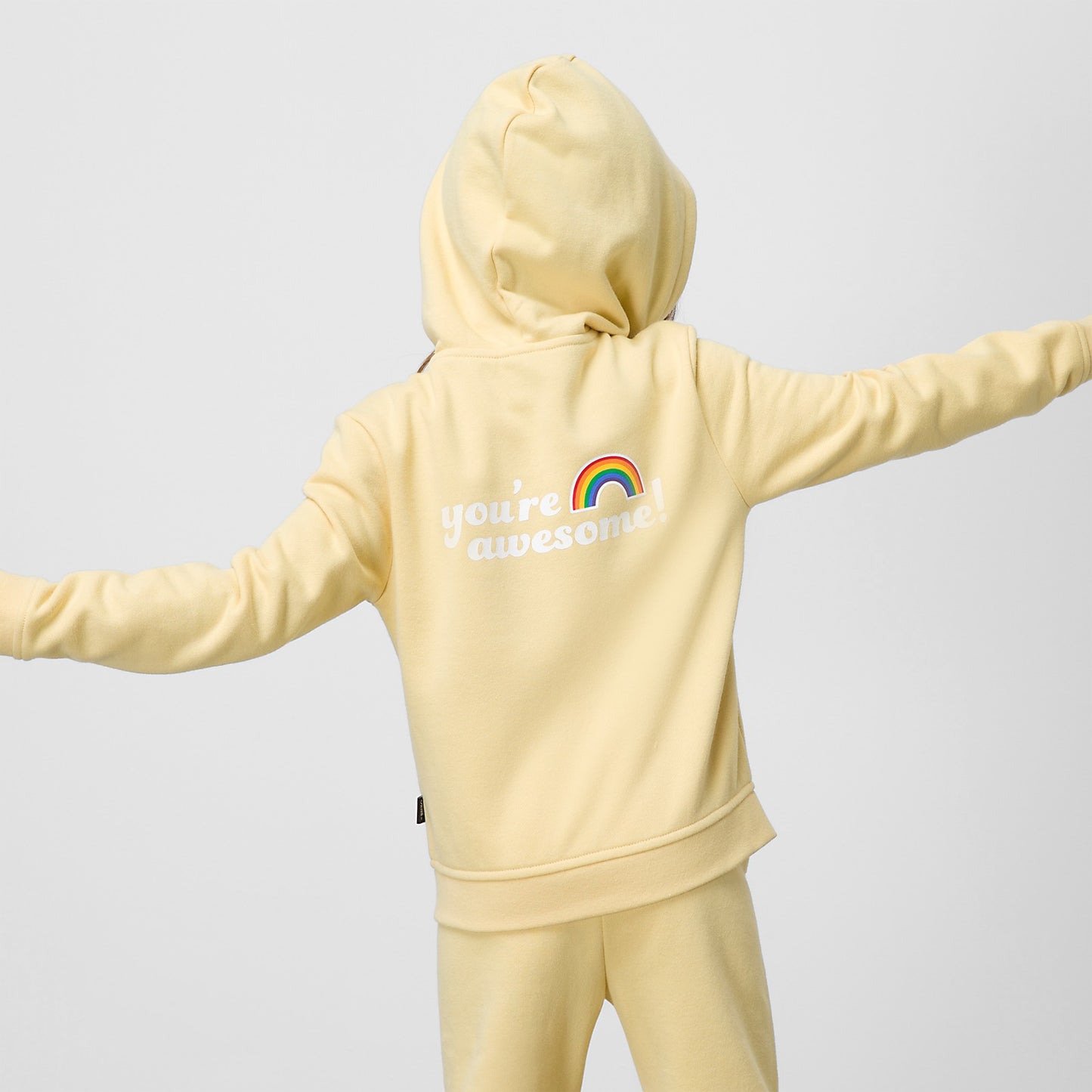 The Kids Radically Happy Zip Hoodie makes it easy to smile with bright, fun graphics and words of affirmation. Made with 60% cotton and 40% polyester, this hooded sweatshirt features a full front zip, a classic fit, and a smiley face screen print at the left chest. At the back, a rainbow screen print is offset with the words, You’re Awesome!