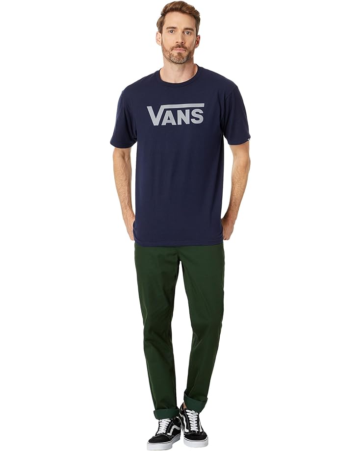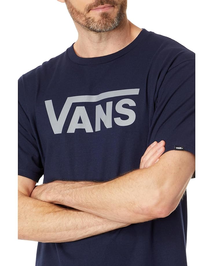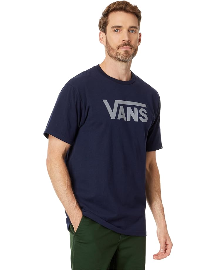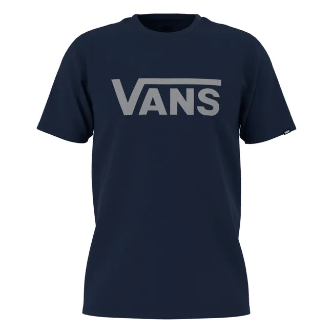 The Vans Classic T-Shirt-Navy/Frost Grey is a super comfortable and stylish way to show your love for the Vans brand. Made from 100% heavyweight ringspun cotton, this tee sports a classic fit and traditional short-sleeve crew neck design. The bold contrasting Vans Drop-V logo centered on the chest is screen-printed for lasting style. Whether you are out riding hard or just chilling with friends, Vans makes sure you look good and feel good.