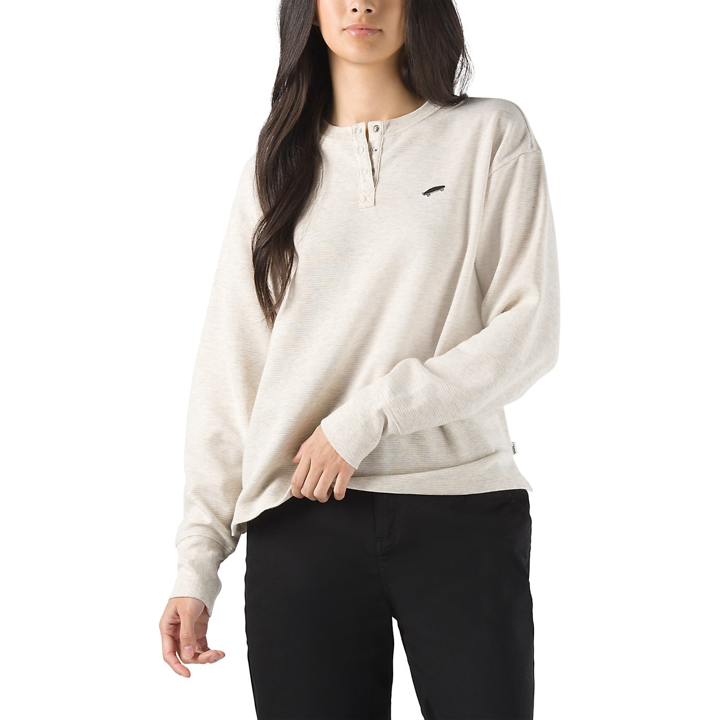 The Salton Henley is a 60% cotton, 40% polyester heather long sleeve henley top with an ottoman texture, snap-front placket, back yoke detail, and classic skateboard embroidery at the chest. Dropped shoulders and wider sleeve cuffs round out the design. Model is 5 feet 9 inches tall and wearing a size Small.