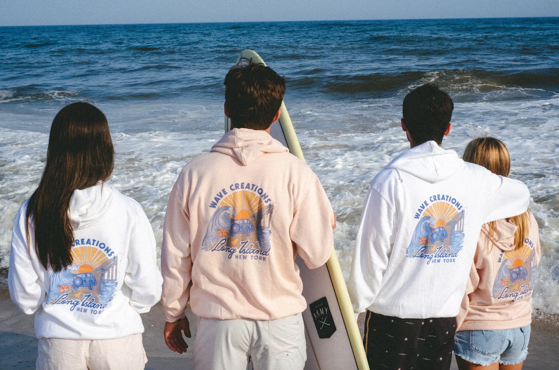 Embrace the cozy vibes with our new Vintage Islander Hoodie, inspired by the iconic Ponquogue Bridge in Long Island's favorite beach town. This vibrant design brings a touch of seaside charm to your wardrobe with eye-catching shades of blue and orange.